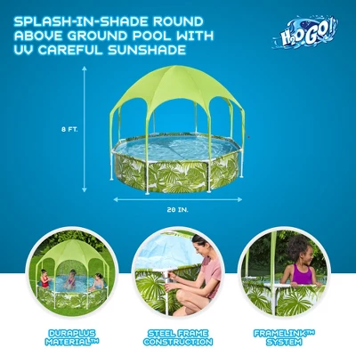 Enjoy the sun or relax in the shade with the H2OGO! Splash-in-Shade Pool with Sunshade.The steel frame resists corrosion and is equipped with a FrameLink System for a sturdy frame connection, while protective connectors ensure there’s no damage from metal-on-metal contact. The sturdy DuraPlus liner is made out of an ultra-durable 3-layer material that is reinforced for strength and resisting punctures.With a UPF rating of 40-plus, the canopy shade protects against the sun, whether your children are splashing or relaxing. Plus, there’s a water mister at the top of the shade for added fun and cooling off. Simply connect the kiddie pool to a garden hose for a continuous cooling mist. The pool is also equipped with connection valves for Flowclear filter pumps (sold separately). Easy to set up with 2 to 3 people this 8-foot pool can be ready for water within 20 minutes! To take down, simply attach a garden hose to the flow control drain valve to release water from the pool. The pool is also equipped with connection valves for Flowclear filter pumps (sold separately).Summer after summer, the H2OGO! Splash-in-Shade Pool is perfect for your family!