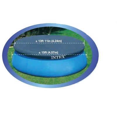 **INTEX 15′ Easy Set Pool Cover**Spend more time swimming in your pool this summer and less time cleaning it with the **INTEX 15′ Easy Set Pool Cover**. This above ground pool cover helps keep your pool free of dirt, insects and debris when not in use. Constructed of high quality, durable 7 gauge, UV resistant PVC vinyl, this pool cover features drain holes to prevent water from accumulating on top. Having your pool covered also helps to prevent evaporation which means adding less water and chemicals to your pool.