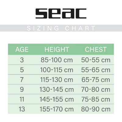 - The Seac Dolphin junior suit for sea and pool is available in 2 colors – blue / black and fuchsia / black – and in 6 sizes: 2-3 years, 4-5 years, 6-7 years, 8-9 years, 10- 11 years, 12-13 years.